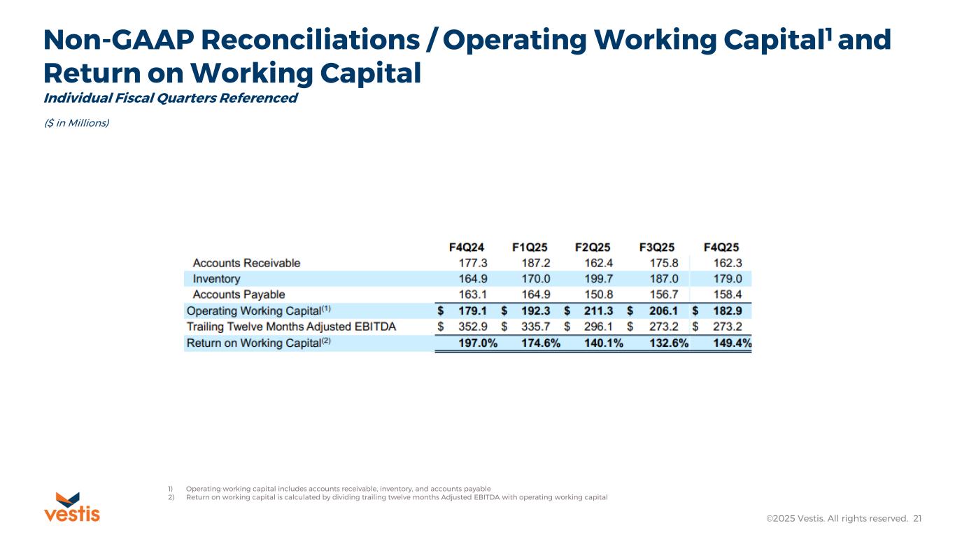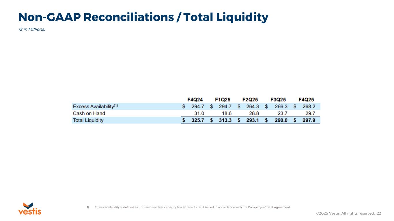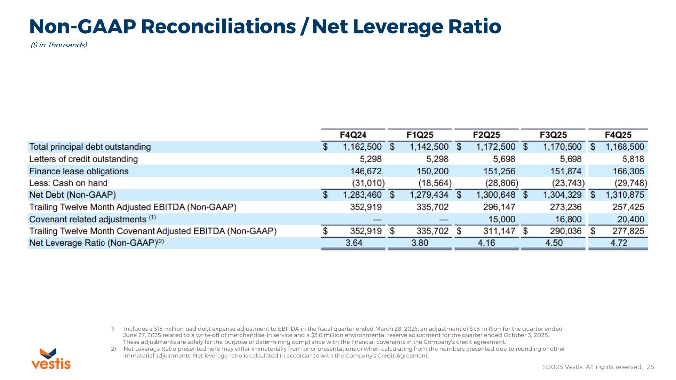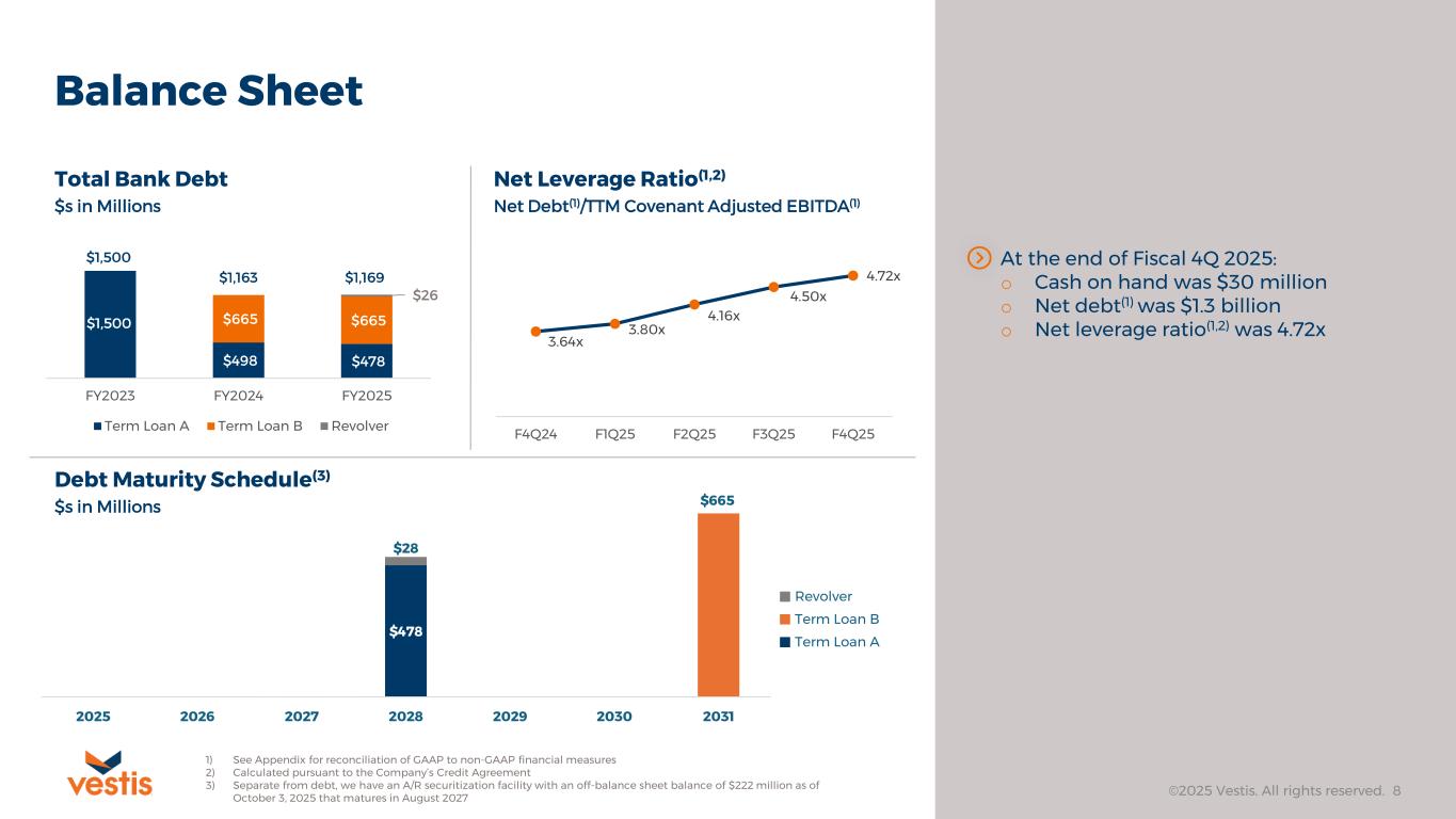 Non-GAAP Measures Vestis reports its financial results in accordance with U.S. GAAP, but in this presentation and the non-GAAP reconciliations that follow, Vestis also uses the following non-GAAP measures: Normalized Revenue, Adjusted EPS, Adjusted Gross Profit, Adjusted Gross Margin, Adjusted EBITDA, Adjusted EBITDA Margin, Free Cash Flow, Liquidity, Net Debt, Net Leverage Ratio, Trailing Twelve Months Covenant Adjusted EBITDA, and Return on Working Capital. Vestis believes that non-GAAP financial measures, both together with and in addition to the corresponding U.S. GAAP financial measure, are important supplemental measures that exclude non-cash or other items that may not be indicative of or are unrelated to Vestis’ core operating results. Vestis uses these non-GAAP financial measures with U.S. GAAP financial measures and other comparable tools to assist in the evaluation of its operating performance. Vestis believes that presentation of these measures also helps investors because the measures enable better comparisons of Vestis’ historical results and allow investors to evaluate Vestis’ performance based on the same metrics that Vestis uses to evaluate its performance and trends in its results. However, these measures have limitations as analytical tools and should not be considered in isolation or as a substitute for Vestis’ results as reported under U.S. GAAP. Specifically, you should not consider these measures as alternatives to revenue, operating income, operating income margin, net income, net income margin or net cash provided by operating activities determined in accordance with U.S. GAAP. These non-GAAP financial measures also should not be considered as measures of cash available to Vestis to invest in the growth of Vestis’ business or cash that will be available to Vestis to meet its obligations. Non-GAAP financial measures as presented by Vestis may not be comparable to other similarly titled measures of other companies because not all companies use identical calculations. These non-GAAP measures are reconciled in the tables at the end of this presentation. This presentation and the remarks made during the associated conference call are integrally related and are intended to be presented and understood together. Forward-Looking Statements This presentation contains “forward-looking statements” within the meaning of the securities laws. All statements that reflect our expectations, assumptions or projections about the future, other than statements of historical fact, are forward-looking statements, including, without limitation, forecasts relating to discussions of future operations and financial performance and statements regarding our strategy for growth, future product development, regulatory approvals, competitive position and expenditures. In some cases, forward-looking statements can be identified by words such as “potential,” “outlook,” “guidance,” “anticipate,” “continue,” “estimate,” “expect,” “will,” and “believe,” and other words and terms of similar meaning or the negative versions of such words. Examples of forward-looking statements in this release include, but are not limited to, statements regarding: the potential effects and timing of our strategic business actions to enhance both our commercial and operational processes, and our expectations regarding our fiscal year 2026 performance outlook, including the information under the heading “Fiscal Year 2026 Outlook”. These forward-looking statements are subject to risks and uncertainties that may change at any time, and actual results or outcomes may differ materially from those that we expected. Forward-looking statements are not guarantees of future performance and are subject to risks, uncertainties, and changes in circumstances that are difficult to predict including, but not limited to: unfavorable macroeconomic conditions including inflationary pressures and higher interest rates; the failure to retain current customers, renew existing customer contracts and obtain new customer contracts, which could result in continued stock volatility and potential future goodwill impairment charges; competition in our industry; our ability to comply with certain financial ratios, tests and covenants in our credit agreement, including the Net Leverage Ratio; our significant indebtedness and ability to meet debt obligations and our reliance on an accounts receivable securitization facility; our ability to successfully execute or achieve the expected benefits of our restructuring plan and other measures we may take in the future; use of artificial intelligence in our business, which could result in reputational harm, competitive harm, and legal liability; increases in fuel and energy costs and other supply chain challenges and disruptions, including as a result of ongoing military conflicts in Ukraine and the Middle East; implementation of new or increased tariffs and ongoing changes in U.S. and foreign government trade policies, including potential modifications to existing trade agreements and retaliatory measures by foreign governments; increased operating costs and obstacles to cost recovery due to the pricing and cancellation terms of our support services contracts; a determination by our customers to reduce their outsourcing or use of preferred vendors; the outcome of legal proceedings to which we are or may become subject; risks associated with suppliers from whom our products are sourced; challenge of contracts by our customers; currency risks and other risks associated with international operations, including compliance with a broad range of laws and regulations, including the United States Foreign Corrupt Practices Act; increases in labor costs or inability to hire and retain key or sufficient qualified personnel; continued or further unionization of our workforce; our expansion strategy and our ability to successfully integrate the businesses we acquire a