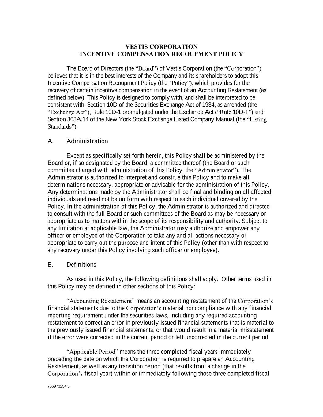 756973254.3 VESTIS CORPORATION INCENTIVE COMPENSATION RECOUPMENT POLICY The Board of Directors (the “Board”) of Vestis Corporation (the “Corporation”) believes that it is in the best interests of the Company and its shareholders to adopt this Incentive Compensation Recoupment Policy (the “Policy”), which provides for the recovery of certain incentive compensation in the event of an Accounting Restatement (as defined below). This Policy is designed to comply with, and shall be interpreted to be consistent with, Section 10D of the Securities Exchange Act of 1934, as amended (the “Exchange Act”), Rule 10D-1 promulgated under the Exchange Act (“Rule 10D-1”) and Section 303A.14 of the New York Stock Exchange Listed Company Manual (the “Listing Standards”). A. Administration Except as specifically set forth herein, this Policy shall be administered by the Board or, if so designated by the Board, a committee thereof (the Board or such committee charged with administration of this Policy, the “Administrator”). The Administrator is authorized to interpret and construe this Policy and to make all determinations necessary, appropriate or advisable for the administration of this Policy. Any determinations made by the Administrator shall be final and binding on all affected individuals and need not be uniform with respect to each individual covered by the Policy. In the administration of this Policy, the Administrator is authorized and directed to consult with the full Board or such committees of the Board as may be necessary or appropriate as to matters within the scope of its responsibility and authority. Subject to any limitation at applicable law, the Administrator may authorize and empower any officer or employee of the Corporation to take any and all actions necessary or appropriate to carry out the purpose and intent of this Policy (other than with respect to any recovery under this Policy involving such officer or employee). B. Definitions As used in this Policy, the following definitions shall apply. Other terms used in this Policy may be defined in other sections of this Policy: “Accounting Restatement” means an accounting restatement of the Corporation’s financial statements due to the Corporation’s material noncompliance with any financial reporting requirement under the securities laws, including any required accounting restatement to correct an error in previously issued financial statements that is material to the previously issued financial statements, or that would result in a material misstatement if the error were corrected in the current period or left uncorrected in the current period. “Applicable Period” means the three completed fiscal years immediately preceding the date on which the Corporation is required to prepare an Accounting Restatement, as well as any transition period (that results from a change in the Corporation’s fiscal year) within or immediately following those three completed fiscal