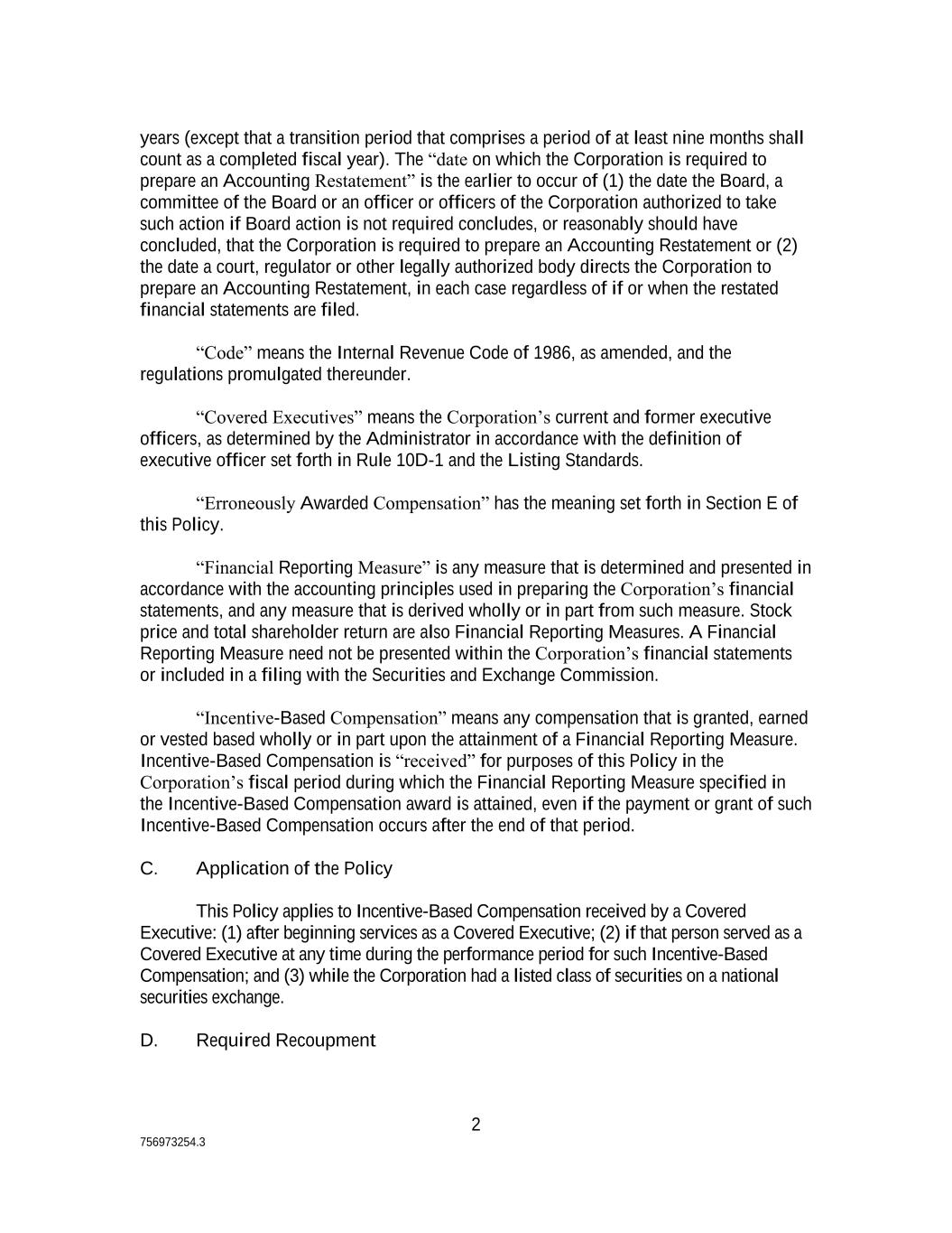 2 756973254.3 years (except that a transition period that comprises a period of at least nine months shall count as a completed fiscal year). The “date on which the Corporation is required to prepare an Accounting Restatement” is the earlier to occur of (1) the date the Board, a committee of the Board or an officer or officers of the Corporation authorized to take such action if Board action is not required concludes, or reasonably should have concluded, that the Corporation is required to prepare an Accounting Restatement or (2) the date a court, regulator or other legally authorized body directs the Corporation to prepare an Accounting Restatement, in each case regardless of if or when the restated financial statements are filed. “Code” means the Internal Revenue Code of 1986, as amended, and the regulations promulgated thereunder. “Covered Executives” means the Corporation’s current and former executive officers, as determined by the Administrator in accordance with the definition of executive officer set forth in Rule 10D-1 and the Listing Standards. “Erroneously Awarded Compensation” has the meaning set forth in Section E of this Policy. “Financial Reporting Measure” is any measure that is determined and presented in accordance with the accounting principles used in preparing the Corporation’s financial statements, and any measure that is derived wholly or in part from such measure. Stock price and total shareholder return are also Financial Reporting Measures. A Financial Reporting Measure need not be presented within the Corporation’s financial statements or included in a filing with the Securities and Exchange Commission. “Incentive-Based Compensation” means any compensation that is granted, earned or vested based wholly or in part upon the attainment of a Financial Reporting Measure. Incentive-Based Compensation is “received” for purposes of this Policy in the Corporation’s fiscal period during which the Financial Reporting Measure specified in the Incentive-Based Compensation award is attained, even if the payment or grant of such Incentive-Based Compensation occurs after the end of that period. C. Application of the Policy This Policy applies to Incentive-Based Compensation received by a Covered Executive: (1) after beginning services as a Covered Executive; (2) if that person served as a Covered Executive at any time during the performance period for such Incentive-Based Compensation; and (3) while the Corporation had a listed class of securities on a national securities exchange. D. Required Recoupment