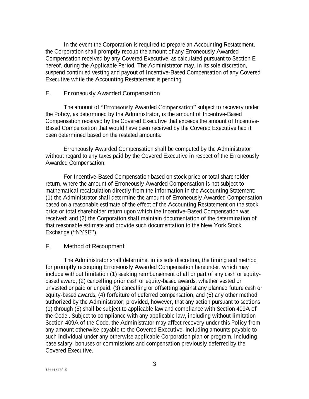 3 756973254.3 In the event the Corporation is required to prepare an Accounting Restatement, the Corporation shall promptly recoup the amount of any Erroneously Awarded Compensation received by any Covered Executive, as calculated pursuant to Section E hereof, during the Applicable Period. The Administrator may, in its sole discretion, suspend continued vesting and payout of Incentive-Based Compensation of any Covered Executive while the Accounting Restatement is pending. E. Erroneously Awarded Compensation The amount of “Erroneously Awarded Compensation” subject to recovery under the Policy, as determined by the Administrator, is the amount of Incentive-Based Compensation received by the Covered Executive that exceeds the amount of Incentive- Based Compensation that would have been received by the Covered Executive had it been determined based on the restated amounts. Erroneously Awarded Compensation shall be computed by the Administrator without regard to any taxes paid by the Covered Executive in respect of the Erroneously Awarded Compensation. For Incentive-Based Compensation based on stock price or total shareholder return, where the amount of Erroneously Awarded Compensation is not subject to mathematical recalculation directly from the information in the Accounting Statement: (1) the Administrator shall determine the amount of Erroneously Awarded Compensation based on a reasonable estimate of the effect of the Accounting Restatement on the stock price or total shareholder return upon which the Incentive-Based Compensation was received; and (2) the Corporation shall maintain documentation of the determination of that reasonable estimate and provide such documentation to the New York Stock Exchange (“NYSE”). F. Method of Recoupment The Administrator shall determine, in its sole discretion, the timing and method for promptly recouping Erroneously Awarded Compensation hereunder, which may include without limitation (1) seeking reimbursement of all or part of any cash or equity- based award, (2) cancelling prior cash or equity-based awards, whether vested or unvested or paid or unpaid, (3) cancelling or offsetting against any planned future cash or equity-based awards, (4) forfeiture of deferred compensation, and (5) any other method authorized by the Administrator; provided, however, that any action pursuant to sections (1) through (5) shall be subject to applicable law and compliance with Section 409A of the Code . Subject to compliance with any applicable law, including without limitation Section 409A of the Code, the Administrator may affect recovery under this Policy from any amount otherwise payable to the Covered Executive, including amounts payable to such individual under any otherwise applicable Corporation plan or program, including base salary, bonuses or commissions and compensation previously deferred by the Covered Executive.