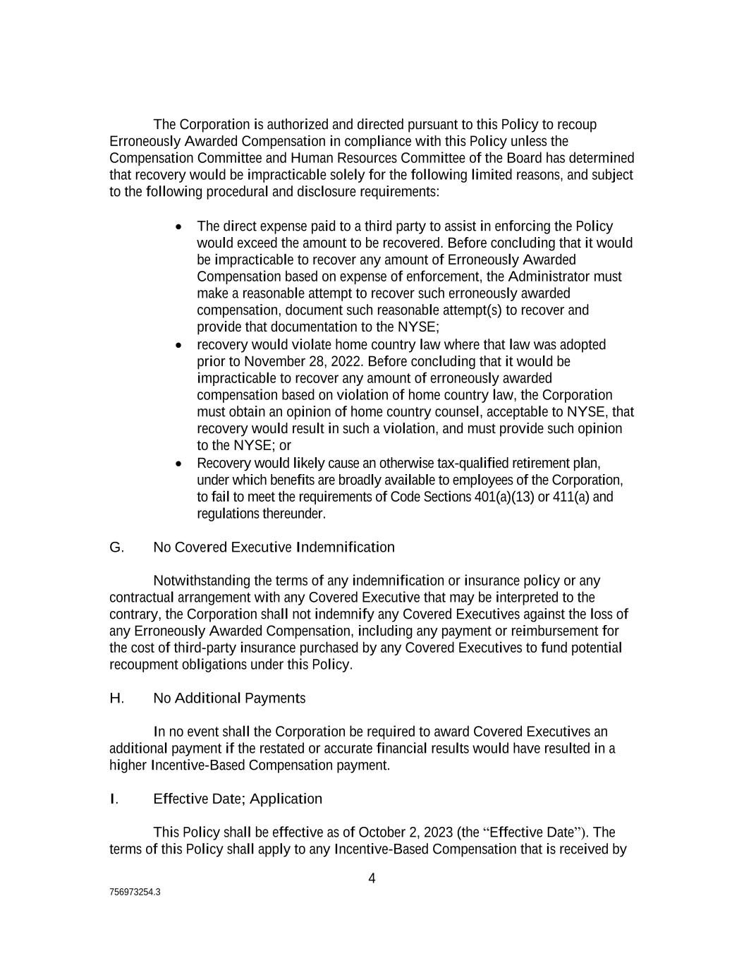 4 756973254.3 The Corporation is authorized and directed pursuant to this Policy to recoup Erroneously Awarded Compensation in compliance with this Policy unless the Compensation Committee and Human Resources Committee of the Board has determined that recovery would be impracticable solely for the following limited reasons, and subject to the following procedural and disclosure requirements: The direct expense paid to a third party to assist in enforcing the Policy would exceed the amount to be recovered. Before concluding that it would be impracticable to recover any amount of Erroneously Awarded Compensation based on expense of enforcement, the Administrator must make a reasonable attempt to recover such erroneously awarded compensation, document such reasonable attempt(s) to recover and provide that documentation to the NYSE; recovery would violate home country law where that law was adopted prior to November 28, 2022. Before concluding that it would be impracticable to recover any amount of erroneously awarded compensation based on violation of home country law, the Corporation must obtain an opinion of home country counsel, acceptable to NYSE, that recovery would result in such a violation, and must provide such opinion to the NYSE; or Recovery would likely cause an otherwise tax-qualified retirement plan, under which benefits are broadly available to employees of the Corporation, to fail to meet the requirements of Code Sections 401(a)(13) or 411(a) and regulations thereunder. G. No Covered Executive Indemnification Notwithstanding the terms of any indemnification or insurance policy or any contractual arrangement with any Covered Executive that may be interpreted to the contrary, the Corporation shall not indemnify any Covered Executives against the loss of any Erroneously Awarded Compensation, including any payment or reimbursement for the cost of third-party insurance purchased by any Covered Executives to fund potential recoupment obligations under this Policy. H. No Additional Payments In no event shall the Corporation be required to award Covered Executives an additional payment if the restated or accurate financial results would have resulted in a higher Incentive-Based Compensation payment. I. Effective Date; Application This Policy shall be effective as of October 2, 2023 (the “Effective Date”). The terms of this Policy shall apply to any Incentive-Based Compensation that is received by