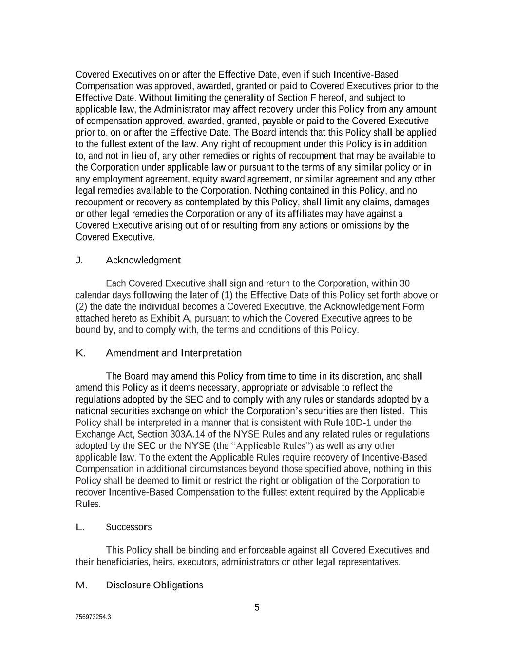 5 756973254.3 Covered Executives on or after the Effective Date, even if such Incentive-Based Compensation was approved, awarded, granted or paid to Covered Executives prior to the Effective Date. Without limiting the generality of Section F hereof, and subject to applicable law, the Administrator may affect recovery under this Policy from any amount of compensation approved, awarded, granted, payable or paid to the Covered Executive prior to, on or after the Effective Date. The Board intends that this Policy shall be applied to the fullest extent of the law. Any right of recoupment under this Policy is in addition to, and not in lieu of, any other remedies or rights of recoupment that may be available to the Corporation under applicable law or pursuant to the terms of any similar policy or in any employment agreement, equity award agreement, or similar agreement and any other legal remedies available to the Corporation. Nothing contained in this Policy, and no recoupment or recovery as contemplated by this Policy, shall limit any claims, damages or other legal remedies the Corporation or any of its affiliates may have against a Covered Executive arising out of or resulting from any actions or omissions by the Covered Executive. J. Acknowledgment Each Covered Executive shall sign and return to the Corporation, within 30 calendar days following the later of (1) the Effective Date of this Policy set forth above or (2) the date the individual becomes a Covered Executive, the Acknowledgement Form attached hereto as Exhibit A, pursuant to which the Covered Executive agrees to be bound by, and to comply with, the terms and conditions of this Policy. K. Amendment and Interpretation The Board may amend this Policy from time to time in its discretion, and shall amend this Policy as it deems necessary, appropriate or advisable to reflect the regulations adopted by the SEC and to comply with any rules or standards adopted by a national securities exchange on which the Corporation’s securities are then listed. This Policy shall be interpreted in a manner that is consistent with Rule 10D-1 under the Exchange Act, Section 303A.14 of the NYSE Rules and any related rules or regulations adopted by the SEC or the NYSE (the “Applicable Rules”) as well as any other applicable law. To the extent the Applicable Rules require recovery of Incentive-Based Compensation in additional circumstances beyond those specified above, nothing in this Policy shall be deemed to limit or restrict the right or obligation of the Corporation to recover Incentive-Based Compensation to the fullest extent required by the Applicable Rules. L. Successors This Policy shall be binding and enforceable against all Covered Executives and their beneficiaries, heirs, executors, administrators or other legal representatives. M. Disclosure Obligations
