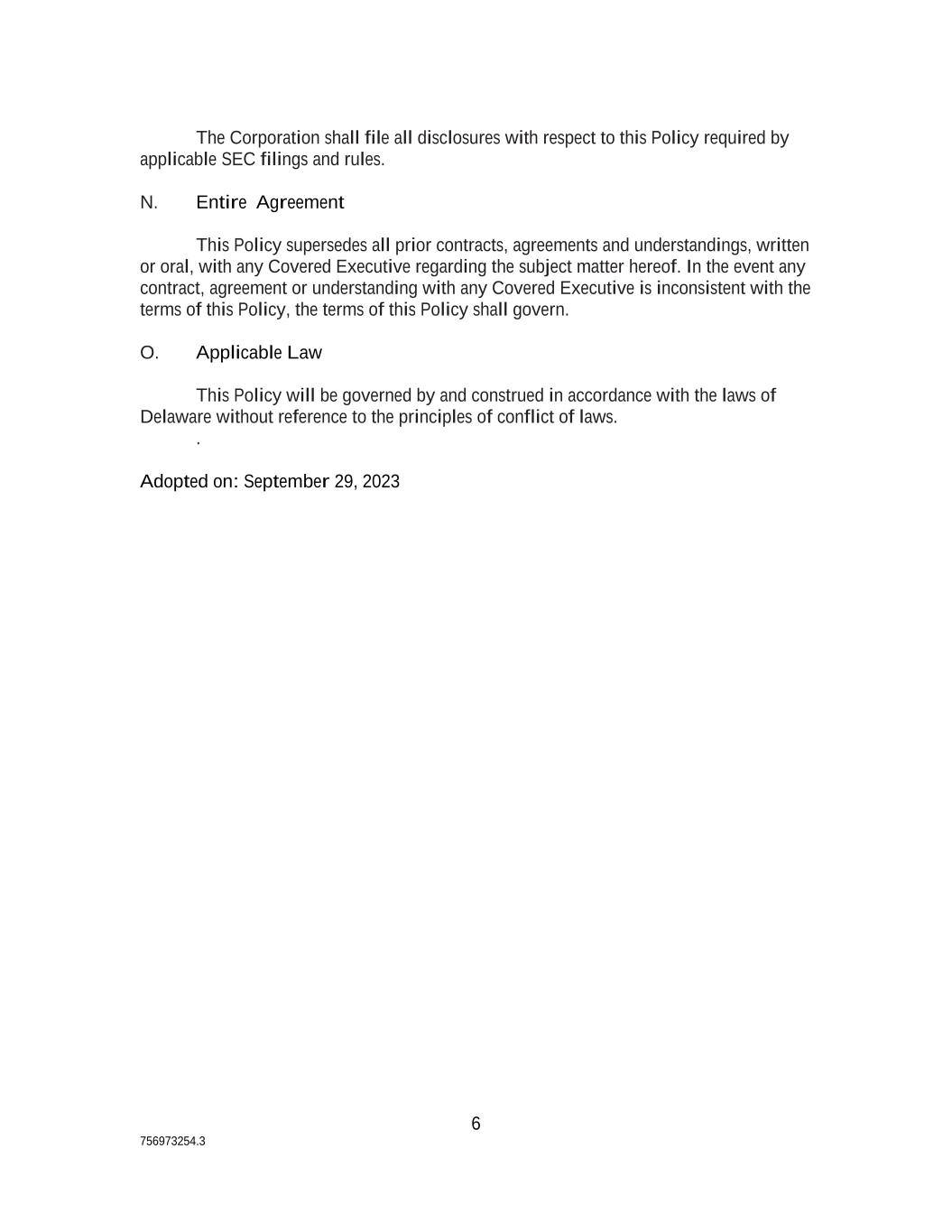 6 756973254.3 The Corporation shall file all disclosures with respect to this Policy required by applicable SEC filings and rules. N. Entire Agreement This Policy supersedes all prior contracts, agreements and understandings, written or oral, with any Covered Executive regarding the subject matter hereof. In the event any contract, agreement or understanding with any Covered Executive is inconsistent with the terms of this Policy, the terms of this Policy shall govern. O. Applicable Law This Policy will be governed by and construed in accordance with the laws of Delaware without reference to the principles of conflict of laws. . Adopted on: September 29, 2023
