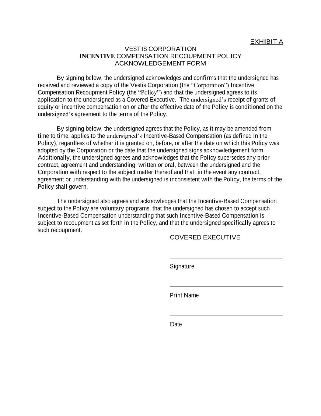 EXHIBIT A VESTIS CORPORATION INCENTIVE COMPENSATION RECOUPMENT POLICY ACKNOWLEDGEMENT FORM By signing below, the undersigned acknowledges and confirms that the undersigned has received and reviewed a copy of the Vestis Corporation (the “Corporation”) Incentive Compensation Recoupment Policy (the “Policy”) and that the undersigned agrees to its application to the undersigned as a Covered Executive. The undersigned’s receipt of grants of equity or incentive compensation on or after the effective date of the Policy is conditioned on the undersigned’s agreement to the terms of the Policy. By signing below, the undersigned agrees that the Policy, as it may be amended from time to time, applies to the undersigned’s Incentive-Based Compensation (as defined in the Policy), regardless of whether it is granted on, before, or after the date on which this Policy was adopted by the Corporation or the date that the undersigned signs acknowledgement form. Additionally, the undersigned agrees and acknowledges that the Policy supersedes any prior contract, agreement and understanding, written or oral, between the undersigned and the Corporation with respect to the subject matter thereof and that, in the event any contract, agreement or understanding with the undersigned is inconsistent with the Policy, the terms of the Policy shall govern. The undersigned also agrees and acknowledges that the Incentive-Based Compensation subject to the Policy are voluntary programs, that the undersigned has chosen to accept such Incentive-Based Compensation understanding that such Incentive-Based Compensation is subject to recoupment as set forth in the Policy, and that the undersigned specifically agrees to such recoupment. COVERED EXECUTIVE Signature Print Name Date