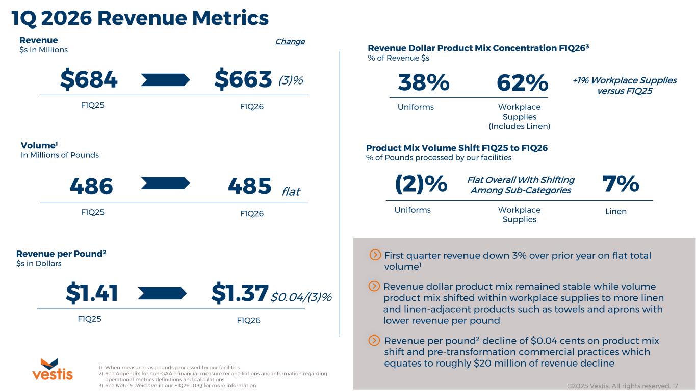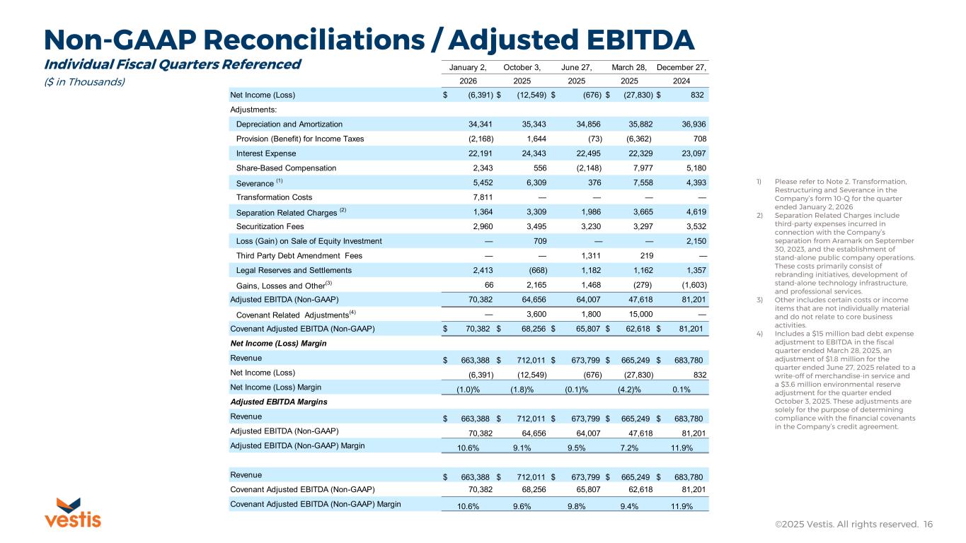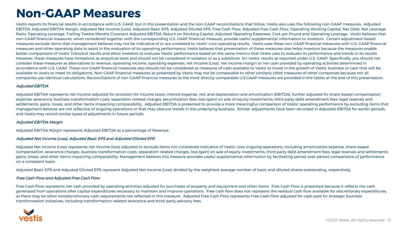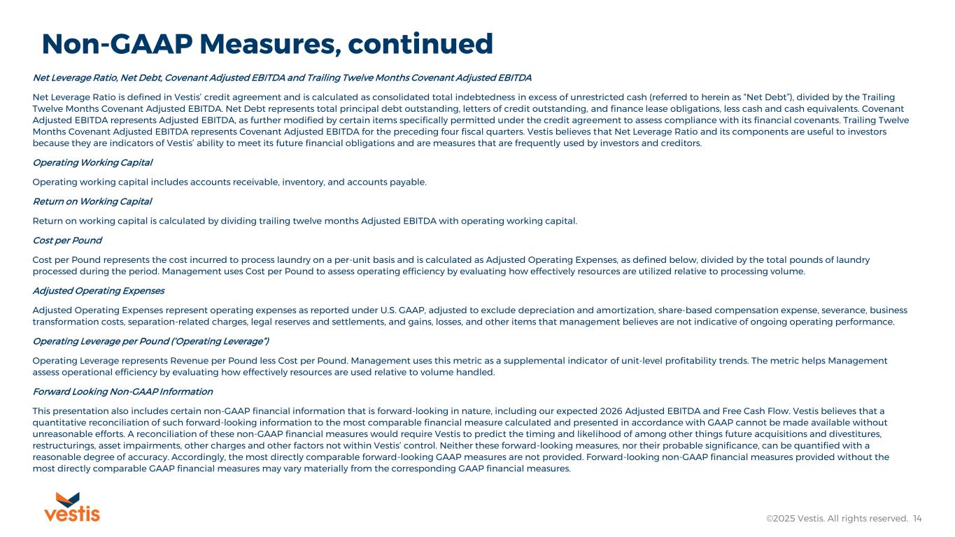 Non-GAAP Financial Measures Vestis reports its financial results in accordance with U.S. GAAP, but in this presentation and the non-GAAP reconciliations that follow, Vestis also uses the following non-GAAP measures: Adjusted Basic Earnings Per Share (“EPS”), Adjusted Diluted EPS, Adjusted EBITDA, Adjusted EBITDA Margin, Adjusted Net Income (Loss), Free Cash Flow, Adjusted Free Cash Flow, Net Debt, Net Leverage Ratio, Operating Leverage, Trailing Twelve Months Covenant Adjusted EBITDA, Adjusted Operating Expenses, Operating Working Capital, Cost per Pound and Return on Working Capital. Vestis believes that non-GAAP financial measures, when considered together with the corresponding U.S. GAAP financial measure, provide useful supplemental information to investors. Certain adjustment-based measures exclude items that management believes may not be indicative of or are unrelated to Vestis’ core operating results. Vestis uses these non-GAAP financial measures with U.S. GAAP financial measures and other operating data to assist in the evaluation of its operating performance. Vestis believes that presentation of these measures also helps investors because the measures enable better comparisons of Vestis’ historical results and allow investors to evaluate Vestis’ performance based on the same metrics that Vestis uses to evaluate its performance and trends in its results. However, these measures have limitations as analytical tools and should not be considered in isolation or as a substitute for Vestis’ results as reported under U.S. GAAP. Specifically, you should not consider these measures as alternatives to revenue, operating income, operating expenses, net income (loss), net income margin or net cash provided by operating activities determined in accordance with U.S. GAAP. These non-GAAP financial measures also should not be considered as measures of cash available to Vestis to invest in the growth of Vestis’ business or cash that will be available to Vestis to meet its obligations. Non-GAAP financial measures as presented by Vestis may not be comparable to other similarly titled measures of other companies because not all companies use identical calculations. Reconciliations of non-GAAP financial measures to the most directly comparable U.S. GAAP measures are provided in the tables at the end of this presentation. Forward-Looking Statements This presentation contains “forward-looking statements” within the meaning of the securities laws. All statements that reflect our expectations, assumptions or projections about the future, other than statements of historical fact, are forward-looking statements, including, without limitation, forecasts relating to discussions of future operations and financial performance and statements regarding our strategy for growth, future product development, regulatory approvals, competitive position and expenditures. In some cases, forward-looking statements can be identified by words such as “potential,” “outlook,” “guidance,” “anticipate,” “continue,” “estimate,” “expect,” “will,” and “believe,” and other words and terms of similar meaning or the negative versions of such words. Examples of forward-looking statements in this release include, but are not limited to, statements regarding: the potential effects of our comprehensive actions to enhance both our commercial and operational processes, and our expectations regarding our fiscal year 2026 performance outlook. These forward-looking statements are subject to risks and uncertainties that may change at any time, and actual results or outcomes may differ materially from those that we expected. Forward-looking statements are not guarantees of future performance and are subject to risks, uncertainties, and changes in circumstances that are difficult to predict including, but not limited to: unfavorable macroeconomic conditions including as a result of government shutdowns, inflationary pressures and higher interest rates; the failure to retain current customers, renew existing customer contracts and obtain new customer contracts, which could result in continued stock volatility and potential future goodwill impairment charges; competition in our industry; our ability to comply with certain financial ratios, tests and covenants in our credit agreement, including the Net Leverage Ratio; our significant indebtedness and ability to meet debt obligations and our reliance on an accounts receivable securitization facility; our ability to successfully execute or achieve the expected benefits of our business transformation and restructuring plan and other measures we may take in the future; increases in fuel and energy costs and other supply chain challenges and disruptions, including as a result of military conflicts in Ukraine and the Middle East; implementation of new or increased tariffs and ongoing changes in U.S. and foreign government trade policies, including potential modifications to existing trade agreements and retaliatory measures by foreign governments; increased operating costs and obstacles to cost recovery due to the pricing and cancellation terms of our support services contracts; a determination by our customers to reduce their outsourcing or use of preferred vendors; the outcome of legal proceedings to which we are or may become subject, including securities litigation claims that could result in significant legal expenses and settlement and damage awards; risks associated with suppliers from whom our products are sourced; challenge of contracts by our customers; currency risks and other risks associated with international operations, including compliance with a broad range of laws and regulations, including the United States Foreign Corrupt Practices Act; increases in labor costs or inability to hire and retain key or sufficient qualified personnel; continued or further unionization of our workforce; our expansion strategy and our ability to succe