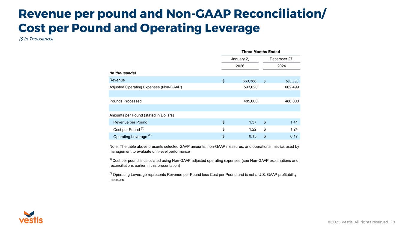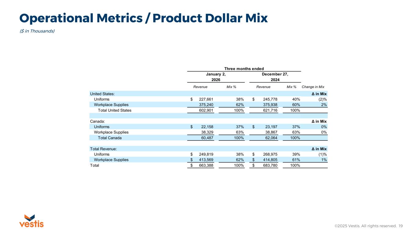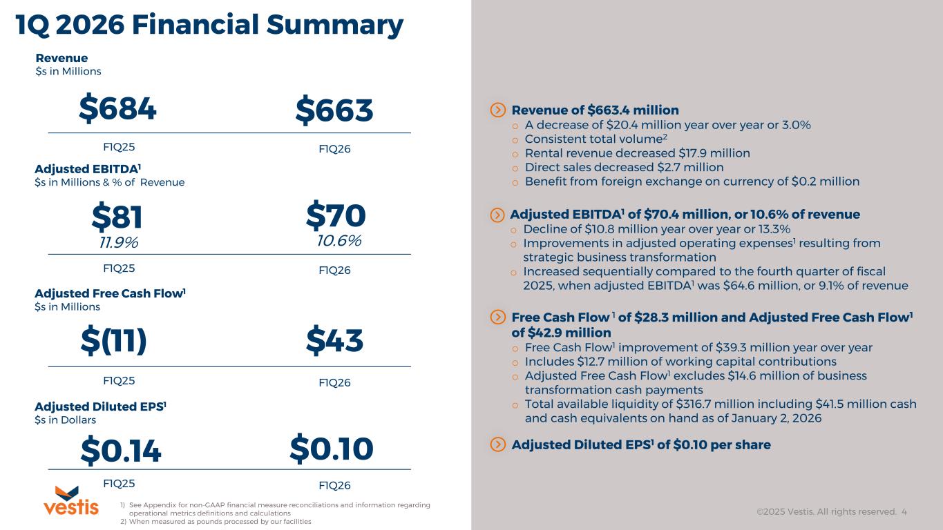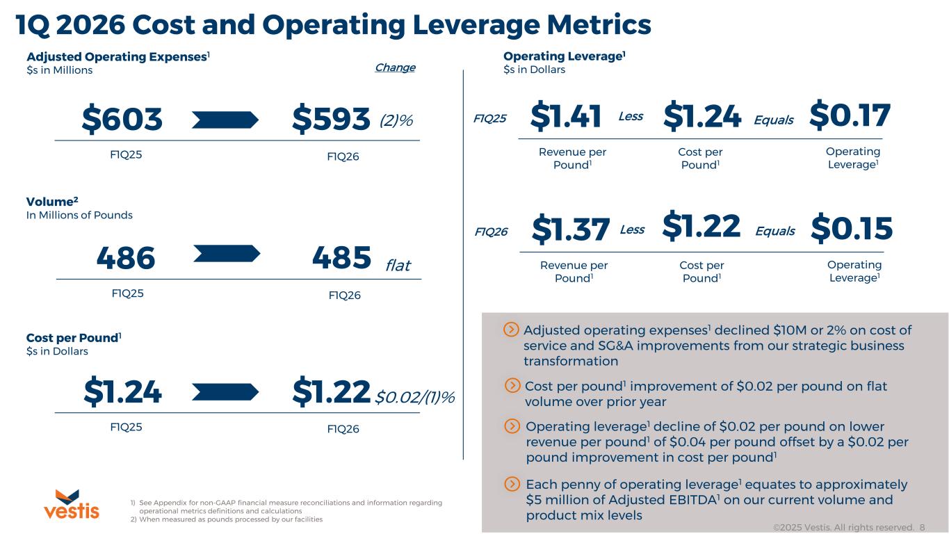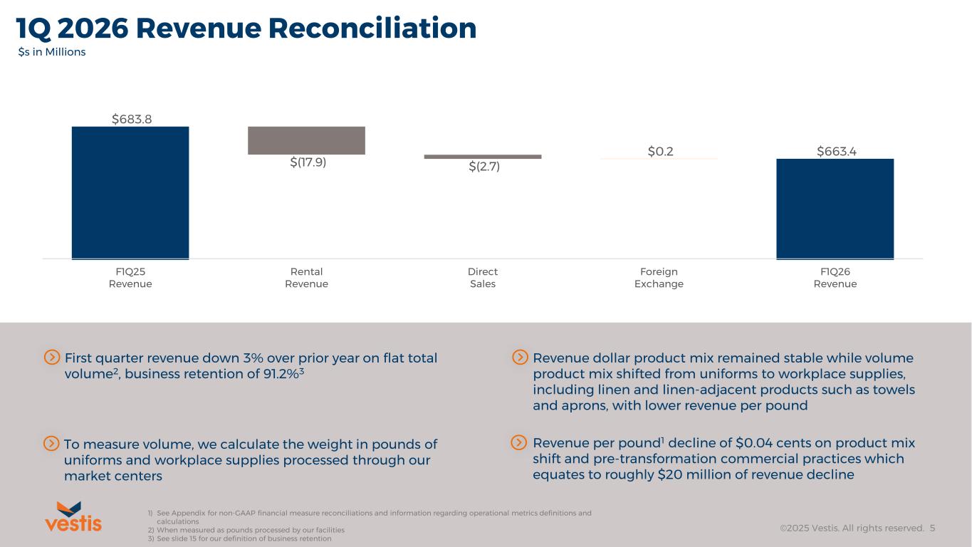 Non-GAAP Financial Measures Vestis reports its financial results in accordance with U.S. GAAP, but in this presentation and the non-GAAP reconciliations that follow, Vestis also uses the following non-GAAP measures: Adjusted Basic Earnings Per Share (“EPS”), Adjusted Diluted EPS, Adjusted EBITDA, Adjusted EBITDA Margin, Adjusted Net Income (Loss), Free Cash Flow, Adjusted Free Cash Flow, Net Debt, Net Leverage Ratio, Operating Leverage, Trailing Twelve Months Covenant Adjusted EBITDA, Adjusted Operating Expenses, Operating Working Capital, Cost per Pound and Return on Working Capital. Vestis believes that non-GAAP financial measures, when considered together with the corresponding U.S. GAAP financial measure, provide useful supplemental information to investors. Certain adjustment-based measures exclude items that management believes may not be indicative of or are unrelated to Vestis’ core operating results. Vestis uses these non-GAAP financial measures with U.S. GAAP financial measures and other operating data to assist in the evaluation of its operating performance. Vestis believes that presentation of these measures also helps investors because the measures enable better comparisons of Vestis’ historical results and allow investors to evaluate Vestis’ performance based on the same metrics that Vestis uses to evaluate its performance and trends in its results. However, these measures have limitations as analytical tools and should not be considered in isolation or as a substitute for Vestis’ results as reported under U.S. GAAP. Specifically, you should not consider these measures as alternatives to revenue, operating income, operating expenses, net income (loss), net income margin or net cash provided by operating activities determined in accordance with U.S. GAAP. These non-GAAP financial measures also should not be considered as measures of cash available to Vestis to invest in the growth of Vestis’ business or cash that will be available to Vestis to meet its obligations. Non-GAAP financial measures as presented by Vestis may not be comparable to other similarly titled measures of other companies because not all companies use identical calculations. Reconciliations of non-GAAP financial measures to the most directly comparable U.S. GAAP measures are provided in the tables at the end of this presentation. Forward-Looking Statements This presentation contains “forward-looking statements” within the meaning of the securities laws. All statements that reflect our expectations, assumptions or projections about the future, other than statements of historical fact, are forward-looking statements, including, without limitation, forecasts relating to discussions of future operations and financial performance and statements regarding our strategy for growth, future product development, regulatory approvals, competitive position and expenditures. In some cases, forward-looking statements can be identified by words such as “potential,” “outlook,” “guidance,” “anticipate,” “continue,” “estimate,” “expect,” “will,” and “believe,” and other words and terms of similar meaning or the negative versions of such words. Examples of forward-looking statements in this release include, but are not limited to, statements regarding: the potential effects of our comprehensive actions to enhance both our commercial and operational processes, and our expectations regarding our fiscal year 2026 performance outlook. These forward-looking statements are subject to risks and uncertainties that may change at any time, and actual results or outcomes may differ materially from those that we expected. Forward-looking statements are not guarantees of future performance and are subject to risks, uncertainties, and changes in circumstances that are difficult to predict including, but not limited to: unfavorable macroeconomic conditions including as a result of government shutdowns, inflationary pressures and higher interest rates; the failure to retain current customers, renew existing customer contracts and obtain new customer contracts, which could result in continued stock volatility and potential future goodwill impairment charges; competition in our industry; our ability to comply with certain financial ratios, tests and covenants in our credit agreement, including the Net Leverage Ratio; our significant indebtedness and ability to meet debt obligations and our reliance on an accounts receivable securitization facility; our ability to successfully execute or achieve the expected benefits of our business transformation and restructuring plan and other measures we may take in the future; increases in fuel and energy costs and other supply chain challenges and disruptions, including as a result of military conflicts in Ukraine and the Middle East; implementation of new or increased tariffs and ongoing changes in U.S. and foreign government trade policies, including potential modifications to existing trade agreements and retaliatory measures by foreign governments; increased operating costs and obstacles to cost recovery due to the pricing and cancellation terms of our support services contracts; a determination by our customers to reduce their outsourcing or use of preferred vendors; the outcome of legal proceedings to which we are or may become subject, including securities litigation claims that could result in significant legal expenses and settlement and damage awards; risks associated with suppliers from whom our products are sourced; challenge of contracts by our customers; currency risks and other risks associated with international operations, including compliance with a broad range of laws and regulations, including the United States Foreign Corrupt Practices Act; increases in labor costs or inability to hire and retain key or sufficient qualified personnel; continued or further unionization of our workforce; our expansion strategy and our ability to succe