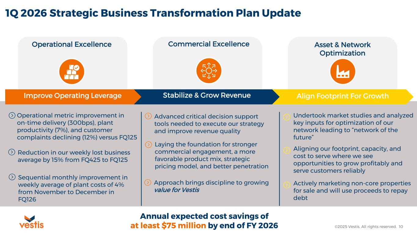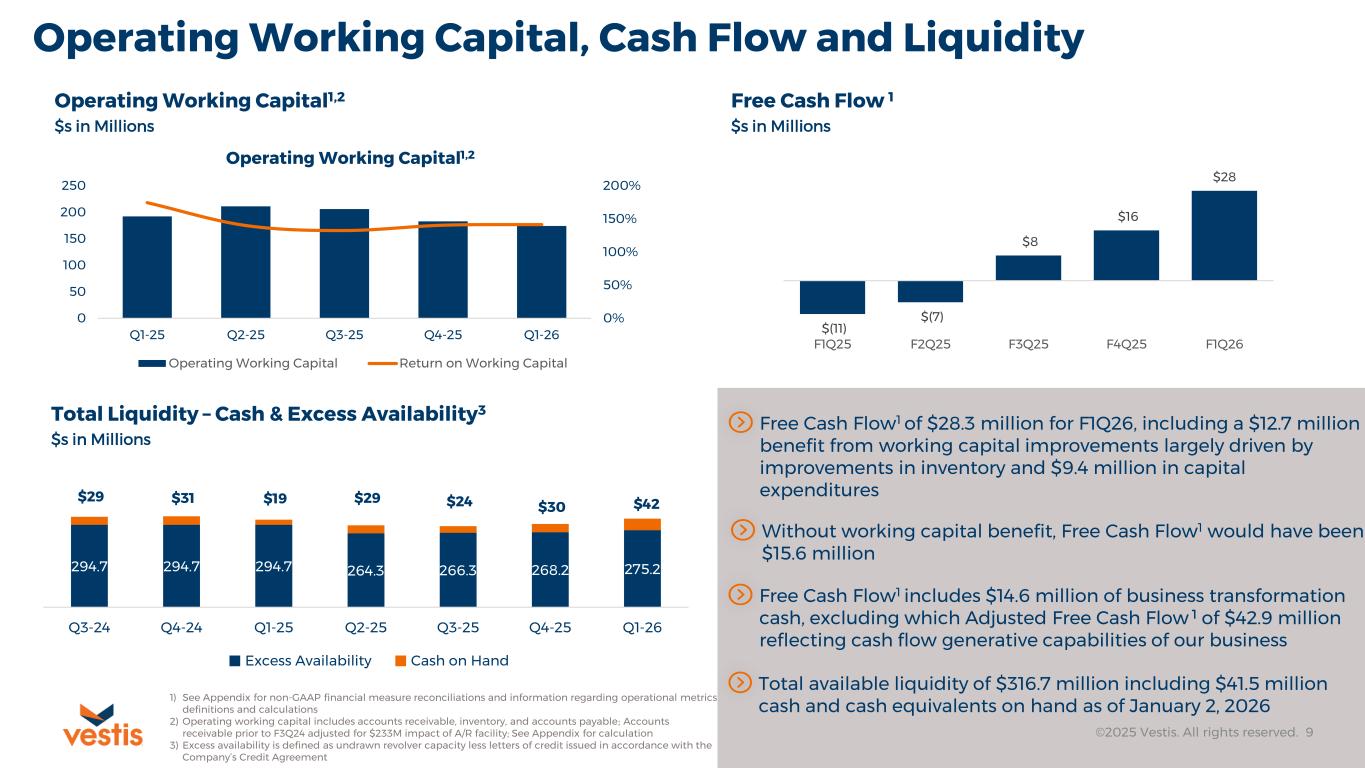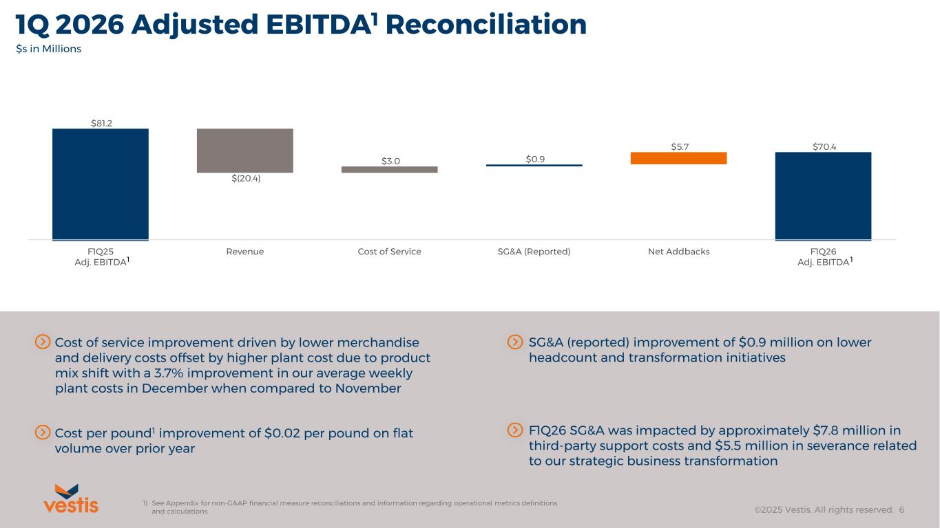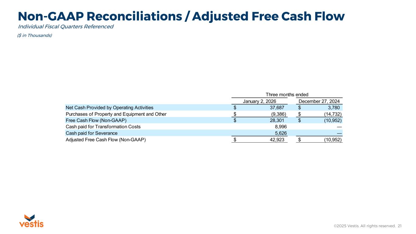 Non-GAAP Financial Measures Vestis reports its financial results in accordance with U.S. GAAP, but in this presentation and the non-GAAP reconciliations that follow, Vestis also uses the following non-GAAP measures: Adjusted Basic Earnings Per Share (“EPS”), Adjusted Diluted EPS, Adjusted EBITDA, Adjusted EBITDA Margin, Adjusted Net Income (Loss), Free Cash Flow, Adjusted Free Cash Flow, Net Debt, Net Leverage Ratio, Operating Leverage, Trailing Twelve Months Covenant Adjusted EBITDA, Adjusted Operating Expenses, Operating Working Capital, Cost per Pound and Return on Working Capital. Vestis believes that non-GAAP financial measures, when considered together with the corresponding U.S. GAAP financial measure, provide useful supplemental information to investors. Certain adjustment-based measures exclude items that management believes may not be indicative of or are unrelated to Vestis’ core operating results. Vestis uses these non-GAAP financial measures with U.S. GAAP financial measures and other operating data to assist in the evaluation of its operating performance. Vestis believes that presentation of these measures also helps investors because the measures enable better comparisons of Vestis’ historical results and allow investors to evaluate Vestis’ performance based on the same metrics that Vestis uses to evaluate its performance and trends in its results. However, these measures have limitations as analytical tools and should not be considered in isolation or as a substitute for Vestis’ results as reported under U.S. GAAP. Specifically, you should not consider these measures as alternatives to revenue, operating income, operating expenses, net income (loss), net income margin or net cash provided by operating activities determined in accordance with U.S. GAAP. These non-GAAP financial measures also should not be considered as measures of cash available to Vestis to invest in the growth of Vestis’ business or cash that will be available to Vestis to meet its obligations. Non-GAAP financial measures as presented by Vestis may not be comparable to other similarly titled measures of other companies because not all companies use identical calculations. Reconciliations of non-GAAP financial measures to the most directly comparable U.S. GAAP measures are provided in the tables at the end of this presentation. Forward-Looking Statements This presentation contains “forward-looking statements” within the meaning of the securities laws. All statements that reflect our expectations, assumptions or projections about the future, other than statements of historical fact, are forward-looking statements, including, without limitation, forecasts relating to discussions of future operations and financial performance and statements regarding our strategy for growth, future product development, regulatory approvals, competitive position and expenditures. In some cases, forward-looking statements can be identified by words such as “potential,” “outlook,” “guidance,” “anticipate,” “continue,” “estimate,” “expect,” “will,” and “believe,” and other words and terms of similar meaning or the negative versions of such words. Examples of forward-looking statements in this release include, but are not limited to, statements regarding: the potential effects of our comprehensive actions to enhance both our commercial and operational processes, and our expectations regarding our fiscal year 2026 performance outlook. These forward-looking statements are subject to risks and uncertainties that may change at any time, and actual results or outcomes may differ materially from those that we expected. Forward-looking statements are not guarantees of future performance and are subject to risks, uncertainties, and changes in circumstances that are difficult to predict including, but not limited to: unfavorable macroeconomic conditions including as a result of government shutdowns, inflationary pressures and higher interest rates; the failure to retain current customers, renew existing customer contracts and obtain new customer contracts, which could result in continued stock volatility and potential future goodwill impairment charges; competition in our industry; our ability to comply with certain financial ratios, tests and covenants in our credit agreement, including the Net Leverage Ratio; our significant indebtedness and ability to meet debt obligations and our reliance on an accounts receivable securitization facility; our ability to successfully execute or achieve the expected benefits of our business transformation and restructuring plan and other measures we may take in the future; increases in fuel and energy costs and other supply chain challenges and disruptions, including as a result of military conflicts in Ukraine and the Middle East; implementation of new or increased tariffs and ongoing changes in U.S. and foreign government trade policies, including potential modifications to existing trade agreements and retaliatory measures by foreign governments; increased operating costs and obstacles to cost recovery due to the pricing and cancellation terms of our support services contracts; a determination by our customers to reduce their outsourcing or use of preferred vendors; the outcome of legal proceedings to which we are or may become subject, including securities litigation claims that could result in significant legal expenses and settlement and damage awards; risks associated with suppliers from whom our products are sourced; challenge of contracts by our customers; currency risks and other risks associated with international operations, including compliance with a broad range of laws and regulations, including the United States Foreign Corrupt Practices Act; increases in labor costs or inability to hire and retain key or sufficient qualified personnel; continued or further unionization of our workforce; our expansion strategy and our ability to succe