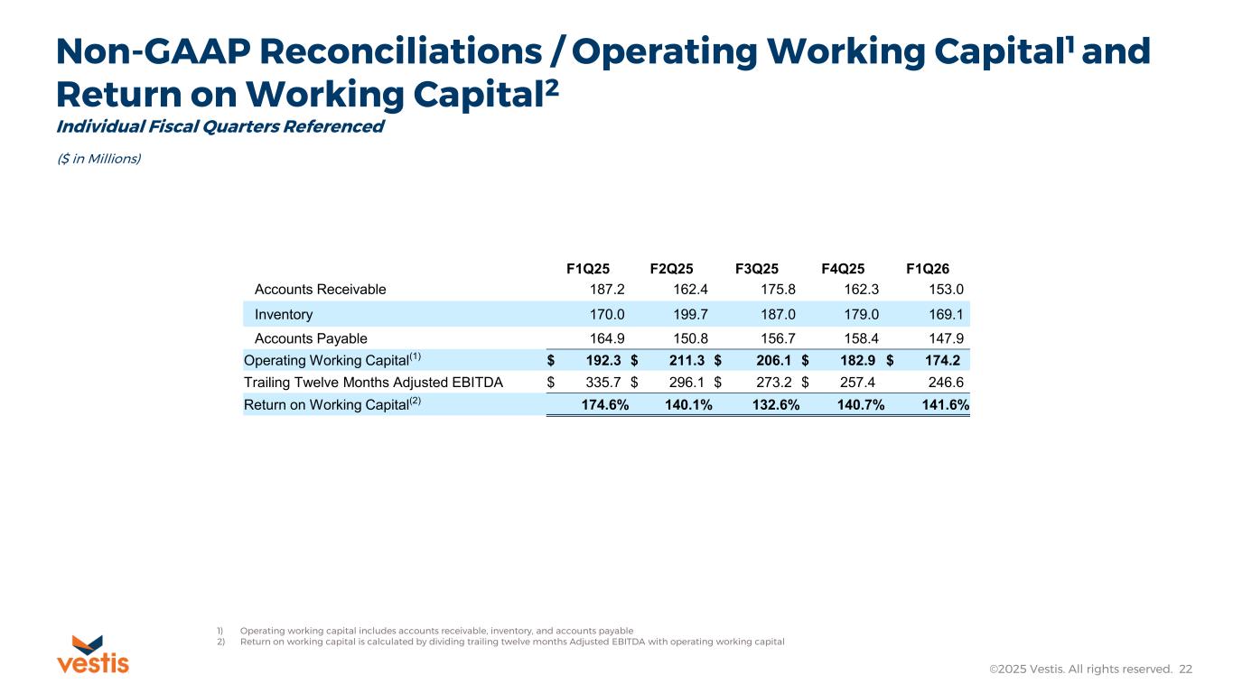 Non-GAAP Reconciliation / Adjusted EPS ©2025 Vestis. All rights reserved. 24 1) Other includes certain costs or income items that are not individually material and do not relate to core business activities (in thousands, except per share amounts) January 2, December 27, 2026 2024 Net Income (Loss) $ (6,391) $ 832 Adjustments: Amortization expense 6,693 6,766 Share-Based Compensation 2,343 5,180 Severance 5,452 4,393 Transformation Costs 7,811 0 Separation Related Charges 1,364 4,619 Legal Reserves and Settlements 2,413 1,357 Gains, Losses and Other (1) 66 (1,603) Loss on Sale of Equity Investment 0 2,150 Tax Impact of Reconciling Items Above (6,622) (5,545) Adjusted Net Income (Loss) (Non-GAAP) $ 13,129 $ 18,149 Basic weighted-average shares outstanding 131,904 131,590 Diluted weighted-average shares outstanding 132,678 132,115 Basic (Loss) Earnings Per Share $ (0.05) $ 0.01 Diluted (Loss) Earnings Per Share $ (0.05) $ 0.01 Adjusted Basic (Loss) Earnings Per Share $ 0.10 $ 0.14 Adjusted Diluted (Loss) Earnings Per Share $ 0.10 $ 0.14 Consolidated Three Months Ended